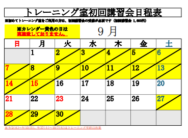 ※9月の下記の日程につきましては、国スポ・障スポ開催のため、トレーニング室休業に伴い、