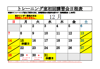 12月のトレーニング室初回講習会は下記の通り実施いたします。予約不要で受講できますので、