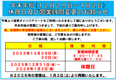 トレーニング室年末年始の営業につきまして、下記の通りご案内申し上げます。
