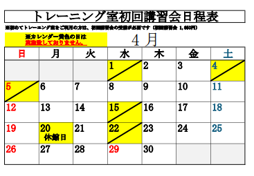 4月のトレーニング室初回講習会は下記の通り実施いたします。予約不要で受講できますので、開催時間講習会費及び持ち物をご確認の上ご来館ください。