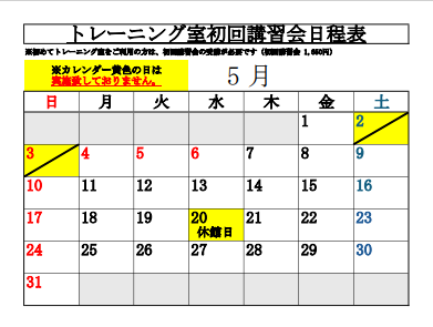 5月のトレーニング室初回講習会は下記の通り実施いたします。予約不要で受講できますので、開催時間講習会費及び持ち物をご確認の上ご来館ください。